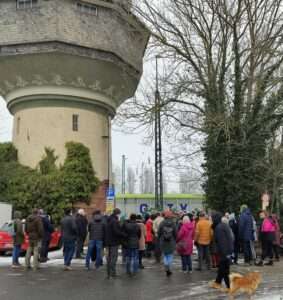Der Rundgang durch die historische Eisenbahnlandschaft, den die Gemeinde Bischofsheim zum ersten Mal anbot, wurde begeistert angenommen. Mehr als 50 Teilnehmende folgten Mechthild Rühl vom Heimat- und Gesichtsverein bei ihrem informativen Winterspaziergang. Stationen des Rundgangs waren das Wahrzeichen von Bischofsheim, der Wasserturm von 1912, das alte Empfangsgebäude von 1862, eine ehemalige Güterhalle, das Lehrstellwerk von 1912, der Rundlokschuppen und das Alte Trafohaus. Während die Gebäude nur von außen besichtigt werden konnten, war der Wagon des Bahnsozialwerks, der neben dem Wasserturm steht, auch von innen zu sehen.