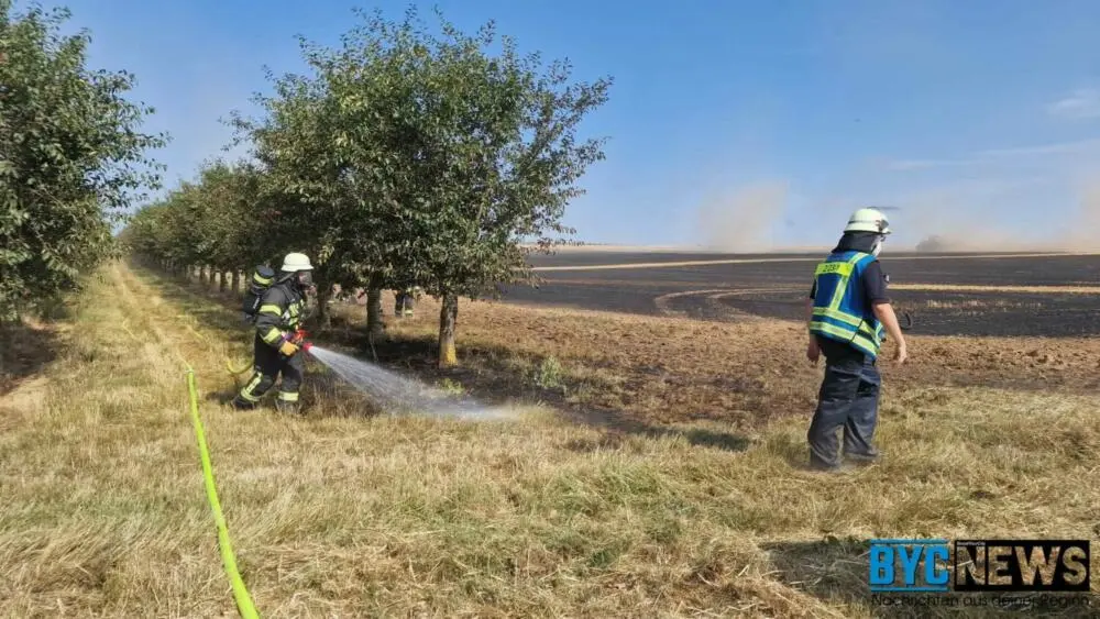 Als die Einsatzkräfte der Feuerwehr und anderer Rettungsdienste am Brandort eintrafen, mussten sie feststellen, dass bereits das Stoppelfeld in Flammen stand. Zusätzlich brannte der Mähdrescher eines Landwirts sowie mehrere Kirschbäume, die an das Feld angrenzten. Angesichts der Gefahr einer weiteren Ausbreitung des Feuers wurde unverzüglich der Löschangriff eingeleitet.