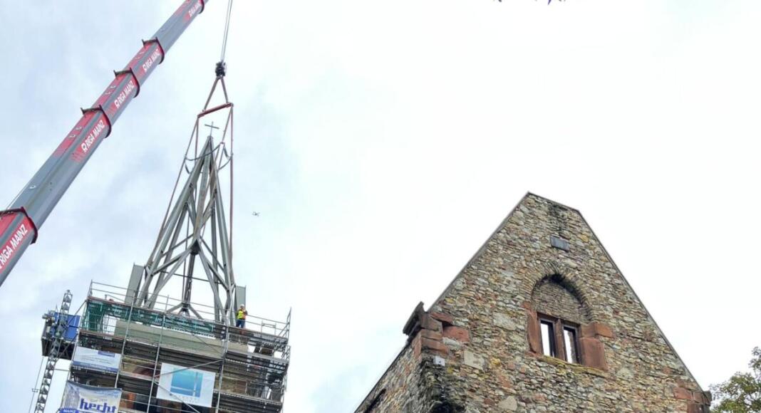 Der Turmhelm wurde als komplettes Bauteil auf den Turmschaft aufgesetzt. Als Teil dieses symbolischen Moments wird die historische Glocke, die einst den Turm zierte, wieder eingebaut – wenn auch ohne ihre ursprüngliche Funktion, jedoch als weiterer Akt des Gedenkens.