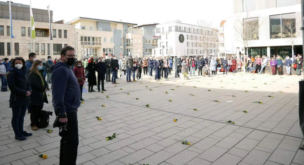 Weit über 100 Ingelheimer kamen am Samstag (12. März 2022) auf dem Fridtjof-Nansen-Platz zusammen, um sich mit den Menschen in der Ukraine solidarisch zu zeigen und ein Zeichen gegen den Krieg zu setzen. Die Stadt Ingelheim hatte zusammen mit dem Weiterbildungszentrum (WBZ) und in Zusammenarbeit mit der Ingelheimer Kultur und Marketing GmbH (IKuM) zu der Versammlung aufgerufen.