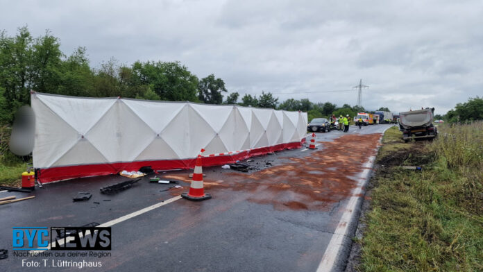 Nach ersten Informationen soll ein Ford Transit vom Fahrdienst der Johanniter-Unfall-Hilfe mit einem Kipplader zusammengestoßen sein. Wie die Polizei mitteilt, kamen bei dem Unfall zwei Personen ums Leben. Darüber hinaus wurden zwei Personen schwer und eine Person leicht verletzt. Bei den verletzten und verstorbenen Personen handelt es sich um die Insassen des Johanniter-Fahrzeugs.