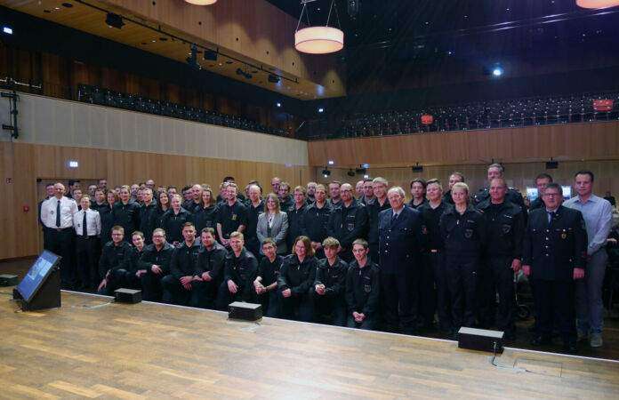 Nach der Pause wartete der offizielle Teil des Abends. Bei den Ver- und Entpflichtungen, Beförderungen, Bestellungen und Ehrungen wurden die einzelnen Feuerwehrleute auf die Bühne gebeten. Herausragend war die Ehrung von Löschmeister Bernd Appel, der für 45 Jahre aktiven Dienst stehende Ovationen erhielt. Brandinspektor Oliver Bender und Hauptbrandmeister Michael Hammer wurden für 25 Jahre aktiven Dienst geehrt. Jendrik Kloos, Jonas Krikken, Christoph Kußmann, Pascal Lehr, Carina Rösch, Thomas Steinbach, Dominik Schapfel und Jörn Schüler erhielten eine Urkunde für 15 Jahre aktiven Dienst. Eine besondere Ehrung erfuhr Manfred Weitmann, der in über 1.000 Lehrgangsstunden unzählige Lehrgänge als Kreisausbilder für den Landkreis Mainz-Bingen durchgeführt hat und hierfür vom Kreisfeuerwehrverband mit dem Ehrenzeichen in Silber ausgezeichnet wurde.
