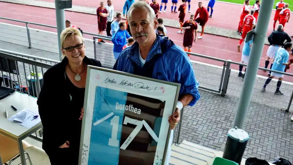 Bei allem Spaß lobte sie trotz Regen den Einsatz aller und freute sich darüber, dass der Kontakt zu anderen Behörden auch außerhalb des Dienstes stets fair sei. Als Trikottausch der etwas anderen Art bekam Dorothea Schäfer vor Anpfiff einen Bilderrahmen mit den Trikots der beiden Mainz-Binger Mannschaften samt Unterschriften der Spieler überreicht und versprach: „Sie bekommen einen Ehrenplatz im Büro.“