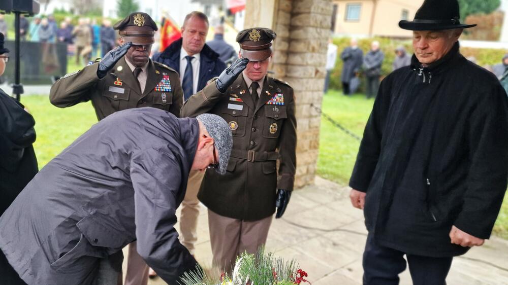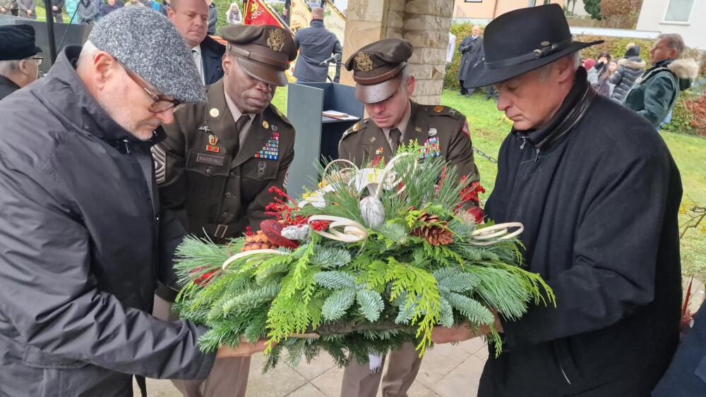 Im Beisein einer Abordnung der US Army legten Oberbürgermeister Ralf Claus, Ortsvorsteher Theobald Paridon gemeinsam mit Colonel Slade Smith und Command Sergeant Major Wendle Marshall in Gedenken an die 86 gefallenen und 20 Vermissten Wackernheimer Bürger einen Kranz am Denkmal auf dem Wackernheimer Friedhof nieder. Damit die Erinnerung an diese Menschen lebendig bleibt, lasen zuvor Kinder der 4. Klasse der Wackernheimer Rabenkopf-Grundschule alle Namen der in den beiden Weltkriegen Gefallenen und Vermissten aus Wackernheim vor.