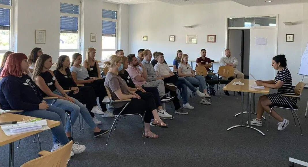 Die Auszubildenden lauschen der Rede der „französischen Staatspräsidentin“ und versuchen diplomatisch am „runden Tisch“ Lösungen zu finden. Foto: Kreisverwaltung Mainz-Bingen / Jana Hollstein