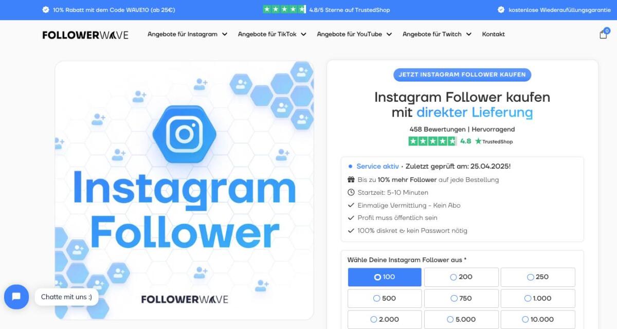 Follower-Wave legt großen Wert auf Diskretion und Qualität. Die gelieferten Follower wirken authentisch und tragen spürbar zur Verbesserung des Profils bei. Darüber hinaus bietet Follower-Wave zusätzliche Services wie Likes, Views und Kommentare an, um das Engagement nachhaltig zu steigern. Besonders vorteilhaft ist die Möglichkeit, kleinere Pakete für den organischen Aufbau zu wählen – ideal für Influencer, die ihr Wachstum natürlich erscheinen lassen möchten.