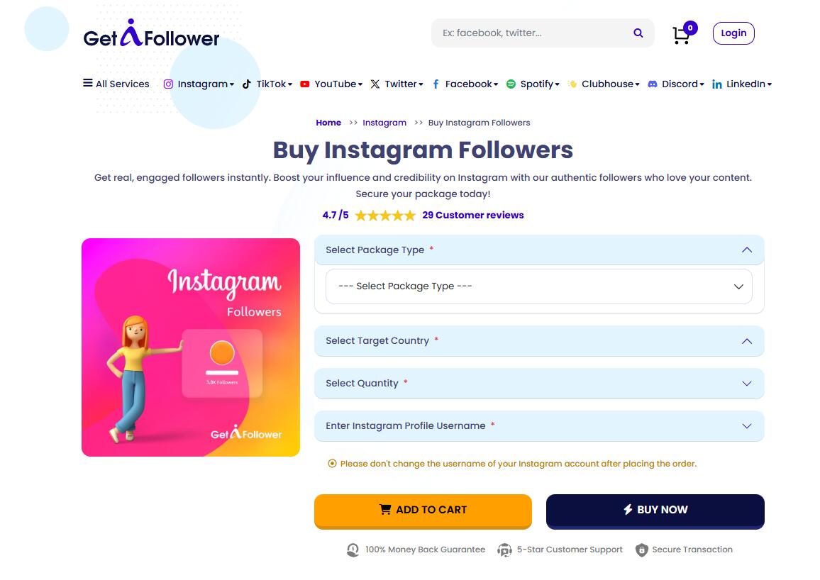 Influencer finden in GetAFollower eine äußerst günstige Website, um hochwertige Instagram-Follower zu einem günstigen Preis kaufen zu können. Die Follower werden zuverlässig nach Anforderung geliefert. Zudem besteht Geld zurück Garantie bei eventuellen Problemen. Der Anbieter bietet zudem mehrere Möglichkeiten, um das Instagram-Konto aufzuwerten. So kann zum Beispiel aus den Kategorien Likes, Views oder Kommentare gekauft werden. Alles in allem ein äußerst zufriedenstellender Anbieter, um günstig Follower zu kaufen.