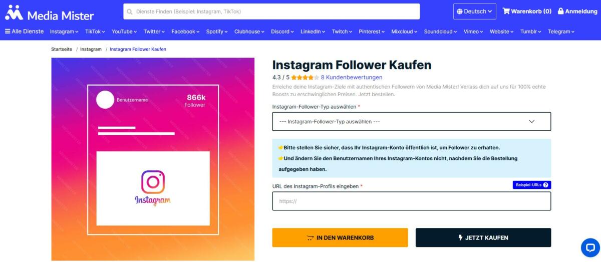 Möchte man als Influencer Follower kaufen, ist Media Mister die beste Wahl. Hervorragende Services und qualitativ hochwertige Follower sind der beste Beweis für diesen Anbieter. Zudem bestärken die außerordentlich guten Bewertungen diese Wahl. Für Influencer ist Media Mister ein guter Partner, um erfolgreich zu sein.