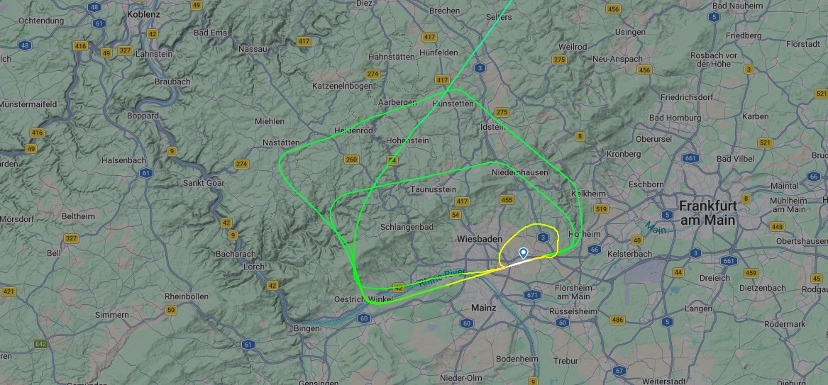 Flugbeobachtungsdienste wie Flightradar24.com dokumentierten, dass die Cessna daraufhin in den Sinkflug ging und mehrere Runden über dem Taunus und dem Rhein-Main-Gebiet drehte. Vor der endgültigen Landung auf dem Militärflugplatz Wiesbaden-Erbenheim um 11:45 Uhr führte die Besatzung zwei Durchstartmanöver durch, bevor das Flugzeug sicher aufsetzte.