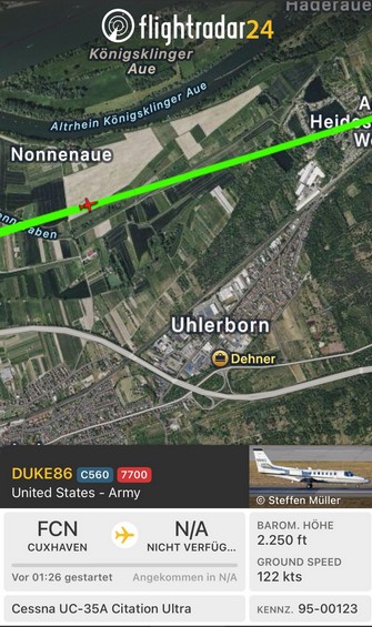 Ein routinemäßiger Verbindungsflug der US Army endete am Mittwochmorgen, 18. März 2026 als Luftnotfall über dem Rhein-Main-Gebiet. Eine Cessna Citation Ultra (Kennung 95-00123), die gegen 11:08 Uhr vom See-Flughafen Cuxhaven/Nordholz gestartet war, musste ihren planmäßigen Flug vorzeitig abbrechen. BYC-News war vor Ort.