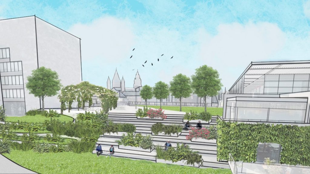 Grünflächen, Sträucher und Bäume sind mit ihrer kühlenden und wasserspeichernden Funktion ein essenzieller Baustein zum Anpassen einer Stadt an die Folgen der globalen Klimakatastrophe. Gerade im Bereich der möglichen Freitreppe, wo der Untergrund nicht durch die Tiefgarage begrenzt ist, sind große Baumpflanzungen und wasserspeichernde Rigolen zum Auffangen starker Regenfälle im Sinne des Sponge-City-Konzeptes möglich.
