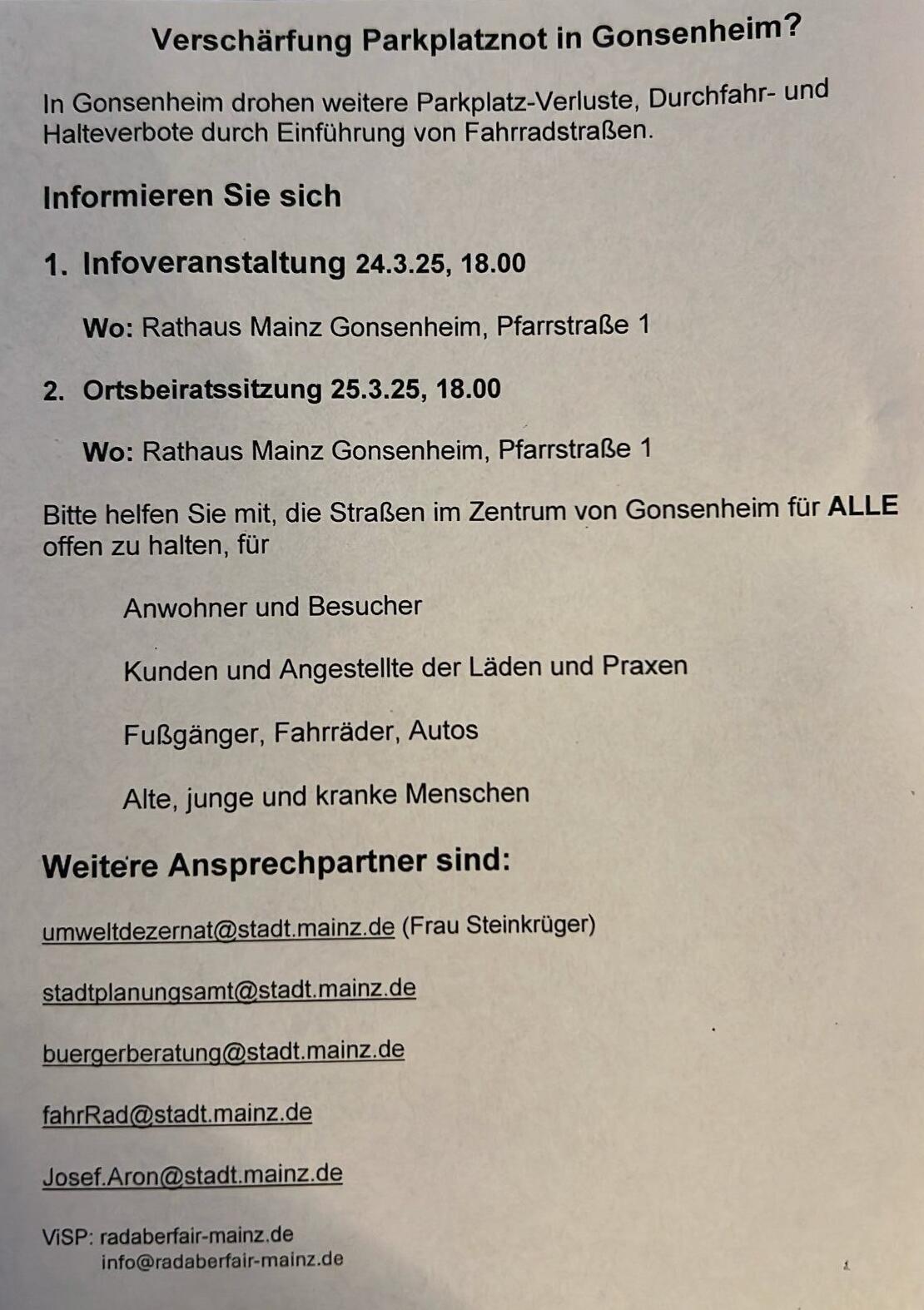 Mainz-Gonsenheim – In den vergangenen Tagen fanden zahlreiche Anwohnerinnen und Anwohner von Gonsenheim Flugblätter in ihren Briefkästen, die auf eine mögliche Verschärfung der Parkplatzsituation hinweisen. Hintergrund sind geplante Veränderungen im Straßenverkehr, insbesondere durch die Einführung von Fahrradstraßen, die zu weiteren Parkplatzverlusten sowie Durchfahr- und Halteverboten führen könnten.