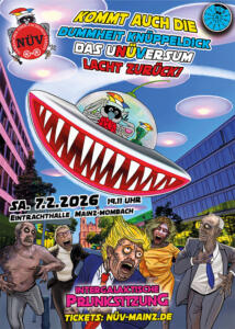 Veranstaltung in Mainz – Der Närrische Überwachungsverein Mainz e.V. (NÜV) eröffnet seine neue Kampagne am Samstag, 7. Februar 2026, mit der „Intergalaktischen Prunksitzung“. Veranstaltungsort ist die Eintrachthalle des Mombacher Turnvereins 1861 e.V., Hauptstraße 51 in Mainz-Mombach. Einlass ist ab 18.11 Uhr, Beginn um 19.11 Uhr.