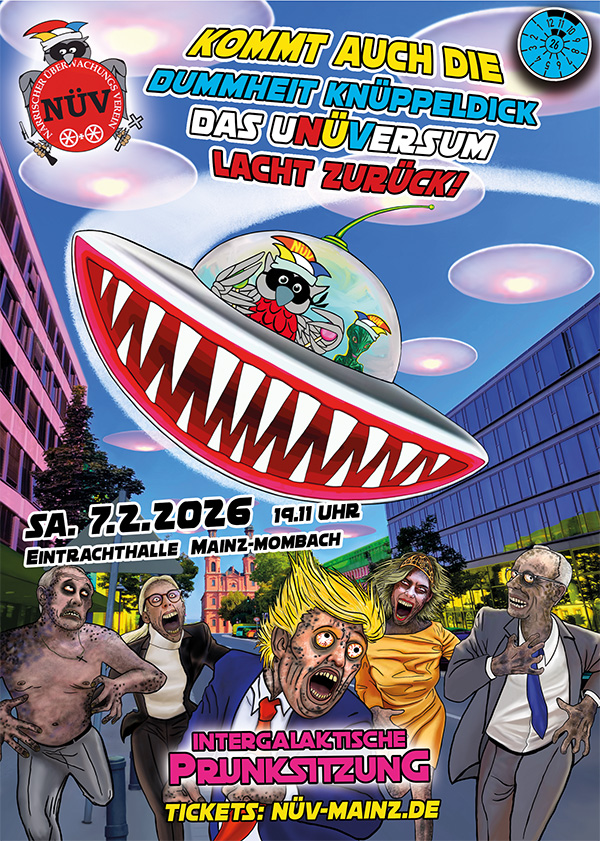Unter dem Kampagnenmotto „Kommt auch die Dummheit knüppeldick, das uNÜVersum lacht zurück!“ setzt der NÜV in dieser Mainzer Fastnachtssaison auf eine kosmische Inszenierung mit klarer Botschaft: Humor als Gegenmittel gegen die Absurditäten des Alltags. In der närrischen Handlung erhält der Verein von einer „intergalaktischen Allianz“ den Auftrag, den Heimatplaneten Erde zu retten.