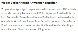 Es ist weitgehend bekannt, dass der Merkurist oft Inhalte übernimmt, ohne Quellenangaben zu machen. Jetzt zeigt sich ein neues Ausmaß an Textmissverständnissen seitens der Blaulicht-Spezialisten des Online-Portals. Als Beispiel sei genannt: „Zu großräumigen Sperrungen, wie es die Internetseite BYC schrieb, sei es aber nicht gekommen, stellt Polizeisprecher Rinaldo Roberto klar. .“