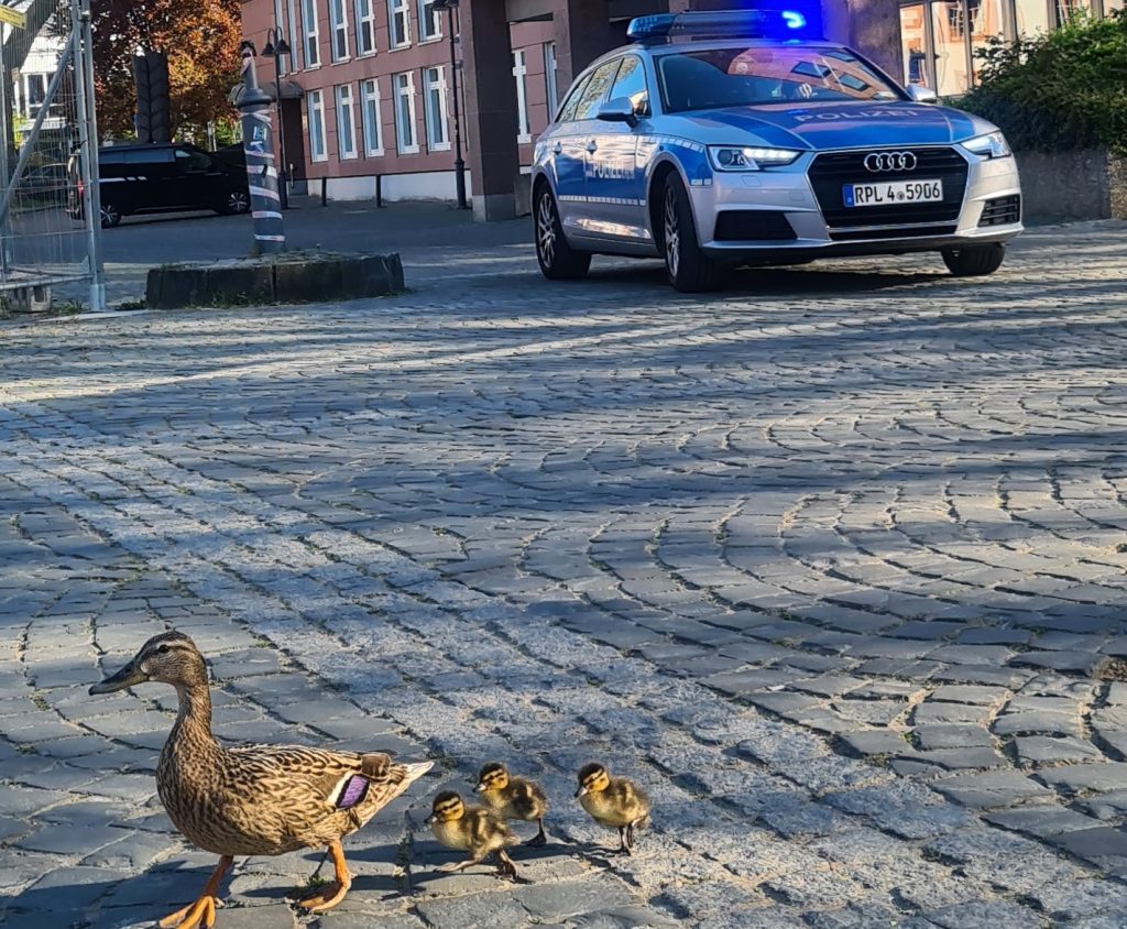 Die Streife, die Bürger und ein Motorradfahrer haben dazu den Verkehr begleitet und abgesichert. Für die Überquerung der Straße wurde kurzzeitig die Peter-Altmeier-Allee abgesichert. Durch die Aktion konnte die Entenfamilie wohlbehalten ans Rheinufer geführt werden.