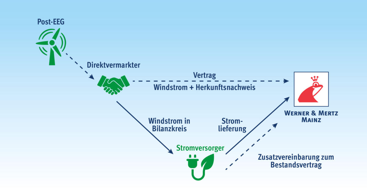 Ein PPA ist ein spezieller Stromliefervertrag, bei dem sowohl das Unternehmen als auch der Anlagenbetreiber direkt eingebunden sind. In diesem Fall stellt die SelzEnergie GmbH für Werner & Mertz zwei ihrer Windkraftanlagen zur Verfügung, die direkt für das Unternehmen Strom produzieren. Neben dem Windparkbetreiber gibt es weitere Partner: Zum einen der bereits bestehende Energieversorger, mit dem eine Zusatzvereinbarung zum Bestandsvertrag geschlossen wurde. Zum anderen gibt es einen Direktvermarkter, er ist das Bindeglied zwischen dem Anlagenbetreiber, dem Stromversorger und dem Unternehmen. Der Stromversorger bekommt die Windstrommengen vom Direktvermarkter und nimmt sie ohne Zusatzkosten in seinen Bilanzkreislauf auf. Werner & Mertz wiederum zahlt als Unternehmen für diese Zusatzleistung ein geringes Entgelt an den Stromversorger. Der Direktvermarkter zahlt dem Windparkbetreiber SelzEnergie für die Erzeugung des Stroms und Werner & Mertz bezahlt den Direktvermarkter für die Abnahme des Stroms, die technische Abwicklung – und für das Risiko.