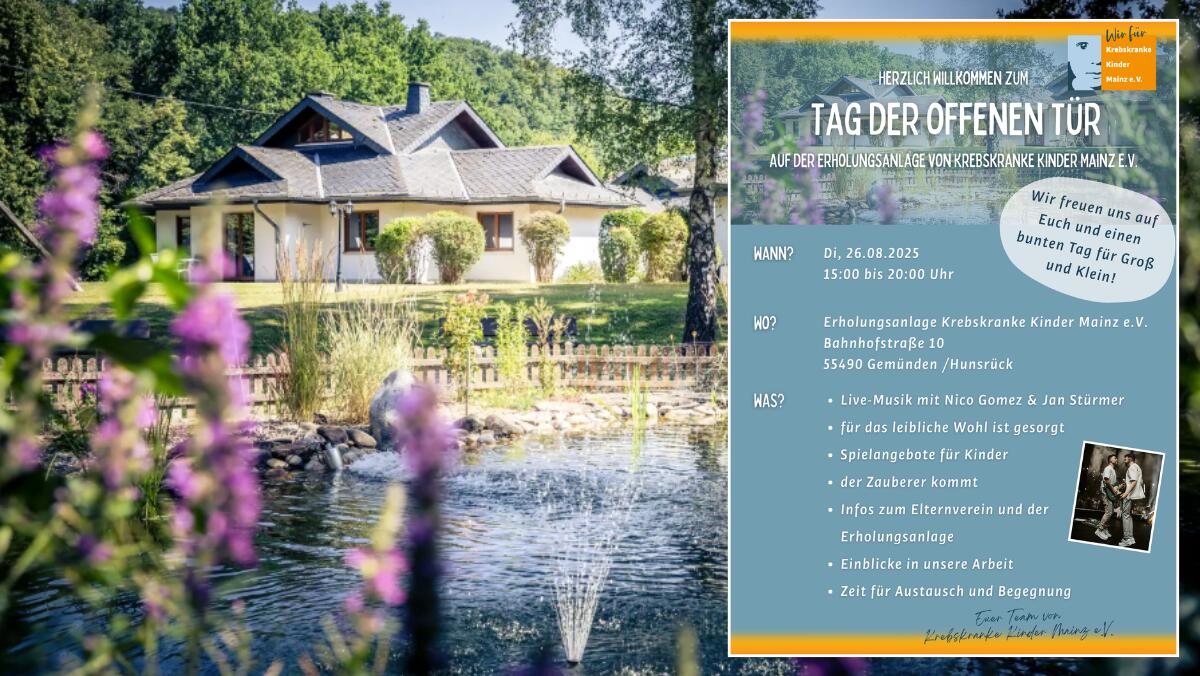 Am Dienstag, den 26. August 2025, lädt der Elternverein die Nachbarschaft, Unterstützerinnen und Unterstützer sowie alle Interessierten herzlich zum Tag der offenen Tür in die Erholungsanlage nach Gemünden ein. Von 15:00 bis 20:00 Uhr erwartet die Gäste ein abwechslungsreiches Programm mit Livemusik mit Nico Gomez und Jan Stürmer, Spielangebote und ein Zauberer für Kinder sowie kulinarischen Angeboten.