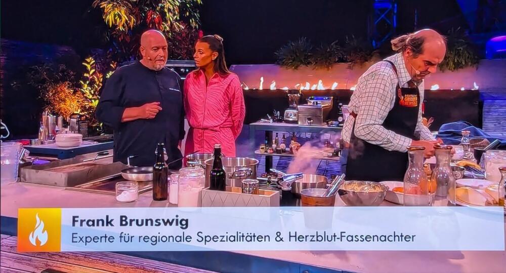 Frank Brunswig kocht gemeinsam mit Guildo Horn das traditionelle Gericht aus Rheinland-Pfalz: Mehlklöße. Der Mainzer Traditionskoch überzeugte beim Duell nicht nur mit seinem kulinarischen Können, sondern auch mit lockeren Sprüchen, die das Publikum zum Lachen brachten. Besonders amüsant war der Moment, als Brunswig erfuhr, dass sein Kochkollege nicht „Guido“, sondern tatsächlich „Guildo“ heißt. Überrascht gestand er, dass er jahrelang vom falschen Vornamen des Sängers ausgegangen war.
