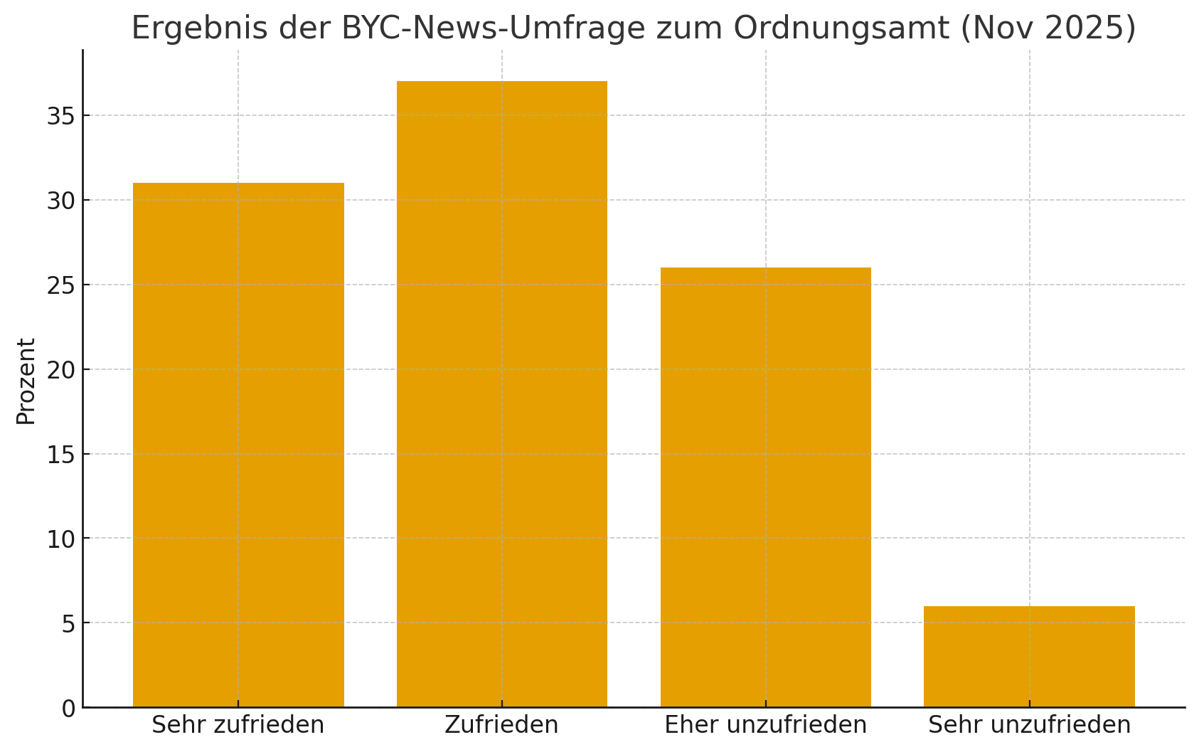 Mainz – Eine von BYC-News Mainz durchgeführte Online-Umfrage zeigt, dass die Mehrheit der Mainzerinnen und Mainzer mit der Arbeit des Ordnungsamts zufrieden ist. Die Umfrage lief vom 01. bis 07. November 2025 und wurde über einen Banner ausgespielt, der per Geo-Location ausschließlich Leserinnen und Lesern in Mainz und seinen Vororten angezeigt wurde. Insgesamt nahmen 3.763 Personen an der Abstimmung teil. Jede Person konnte nur eine Stimme abgeben; nach der Wahl wurde die IP-Adresse für weitere Stimmabgaben gesperrt. Zusätzlich konnte zu jeder Stimme ein Kommentar hinterlassen werden; diese Funktion nutzten 218 Personen.