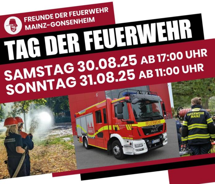 Am letzten Augustwochenende 2025 lädt die Freiwillige Feuerwehr Mainz-Gonsenheim wieder zum traditionellen „Tag der Feuerwehr“ ein. Das beliebte Feuerwehrfest findet am Samstag, 30. August und Sonntag, 31. August 2025 auf dem Gelände der Feuerwehr in Gonsenheim statt – mit einem abwechslungsreichen Programm für Groß und Klein, musikalischer Unterhaltung und einer Fahrzeugausstellung.