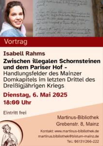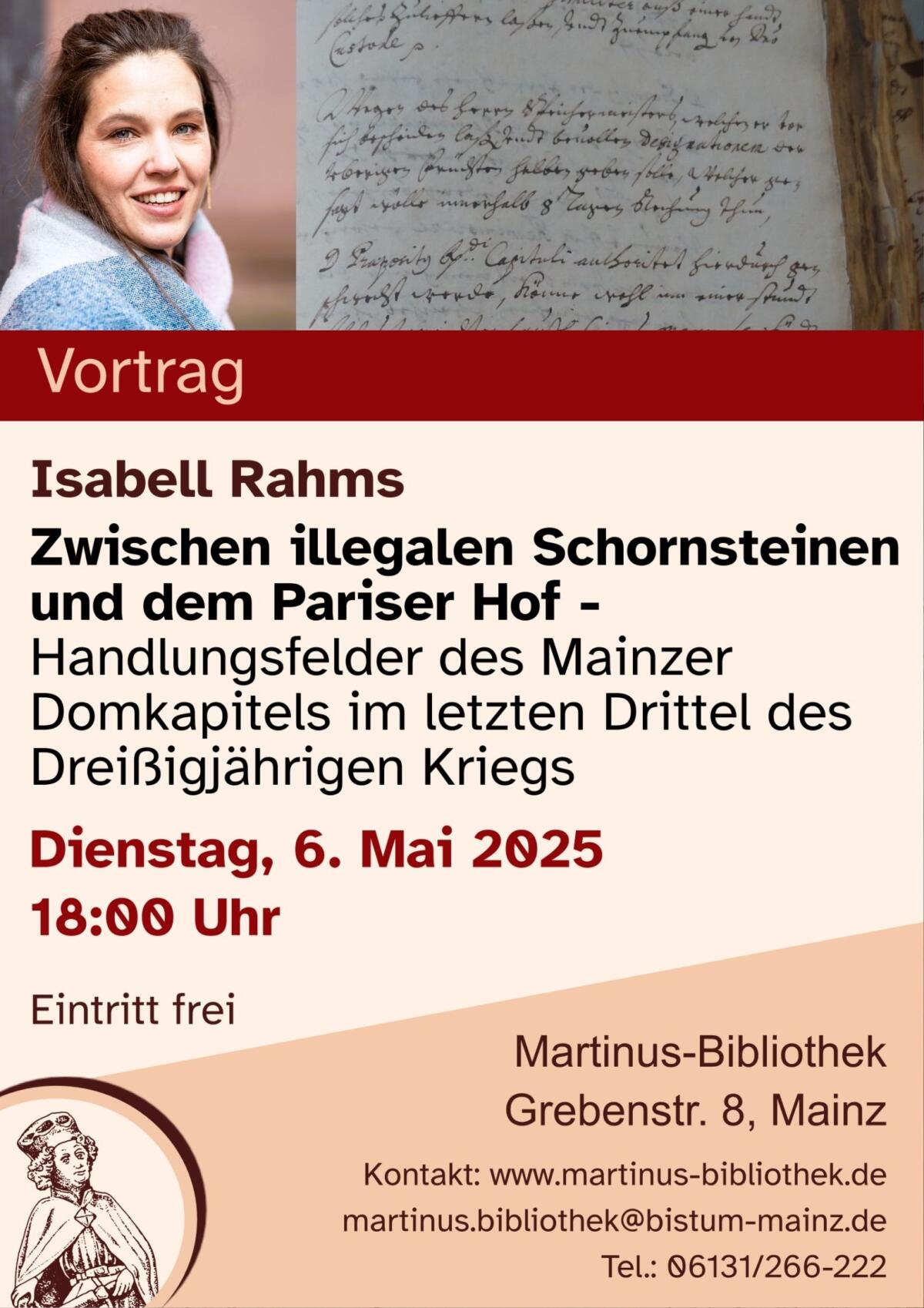 Unter dem Titel „Zwischen illegalen Schornsteinen und dem Pariser Hof“ lädt die Martinus-Bibliothek Mainz am Dienstagabend um 18:00 Uhr zu einem spannenden historischen Vortrag ein. Die Referentin, Isabell Rahms, beleuchtet dabei die Handlungsfelder des Mainzer Domkapitels im letzten Drittel des Dreißigjährigen Kriegs.
