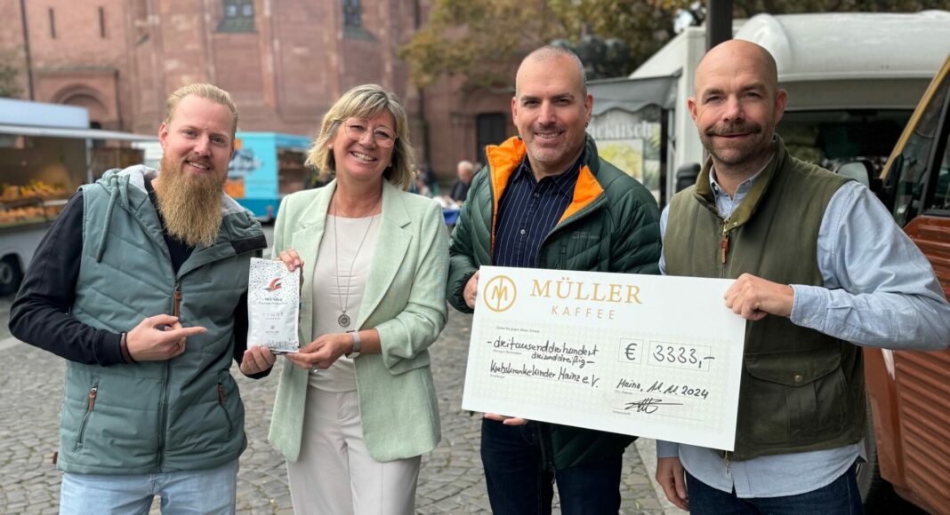 Die Müller Kaffeerösterei übergab heute eine Spende in Höhe von 3333 Euro an den Elternverein Krebskranke Kinder Mainz e.V. Diese Summe stammt aus den Verkäufen des Meenzer Fastnachtskaffees, bei dem pro verkauftem Päckchen 1,11 Euro an den Verein fließen. Der Kaffee wurde gemeinsam mit dem beliebten Fastnachtsduo Dobbelbock kreiert und feiert auch in der neuen Kampagne ab dem 11.11.2024 sein Comeback in den Filialen der Müller Kaffeerösterei und im regionalen Einzelhandel.