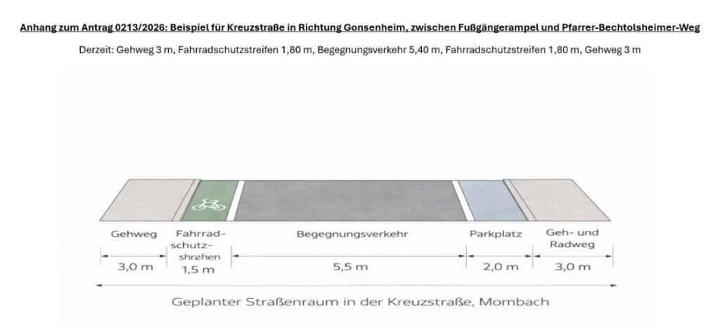 „Die Kreuzstraße geht in diesem Abschnitt ziemlich steil bergauf. Viele Radfahrende nutzen deshalb schon jetzt den Gehweg, obwohl auf der Straße ein 1,80 m breiter Fahrradschutzstreifen angebracht ist. Deshalb machen wir den konkreten Vorschlag, dass man dort von der Hauptstraße in Richtung Gonsenheim kommend, den Radverkehr auf den 3 m breiten Gehweg führt, wo sich Fußgänger und Radfahrer den Gehweg künftig teilen könnten, da der Gehweg dort nicht stark frequentiert wird. Dann wäre hier auch Platz für einen 2 m breiten Parkstreifen auf der Straße mit ausreichend Abstand zur Fußgängerampel, damit diese gut einsichtbar bleibt.