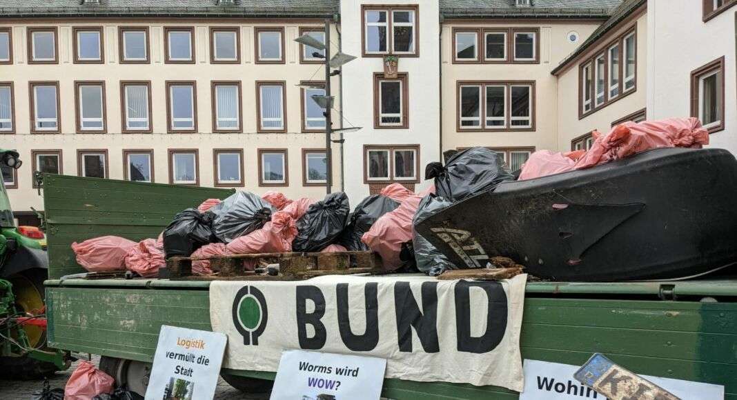 Mit Transparenten wie „Worms wird WOW?“ – „Worms ist Sau(mäßig dreckig)“ und mit dem gesammelten Müll weißt der BUND auf das Müllproblem im Industriegebiet Nord hin. Der Müll in dieser Gegend stammt größtenteils von LKW-Fahrer, die die Wormser Industrie und die Logistiker in Worms anfahren. Die Fahrer nutzen den öffentlichen Raum, um nachts und am Wochenende ihre Fahrzeuge abzustellen und um just in time am nächsten Werktag die Firmen anzufahren. Überquellende Mülleimer und fehlende sanitäre Anlagen führen zu einer starken Vermüllung und Verschmutzung der Randstreifen und angrenzenden Hecken.