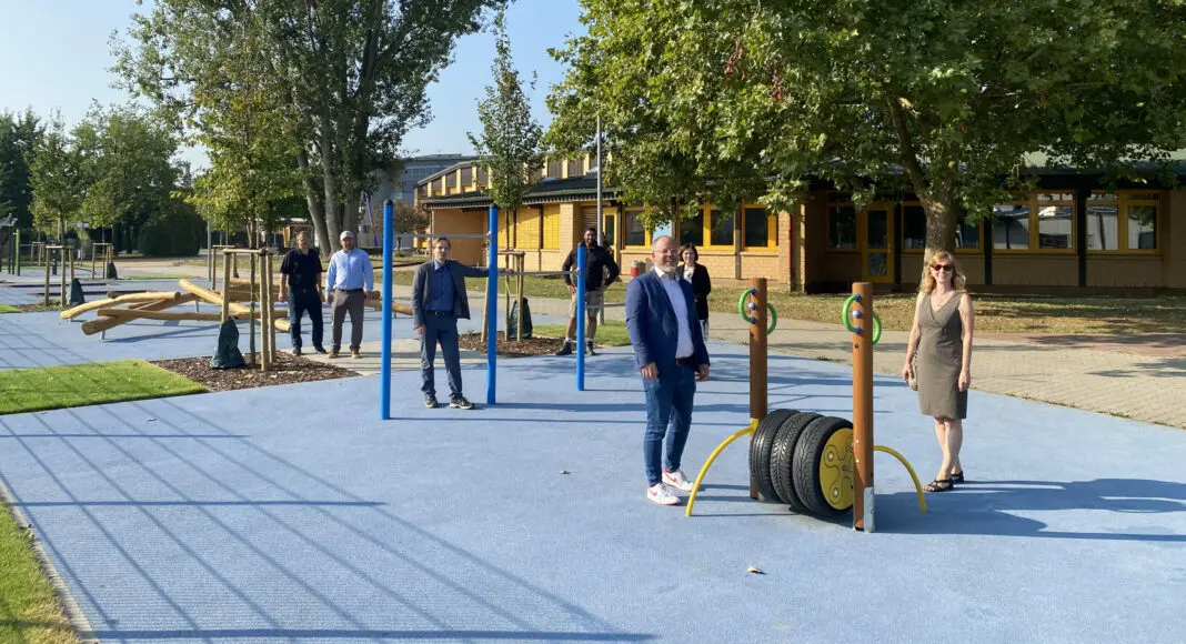 Ein Street-Basketballplatz, vier Tischtennisplatten und ein Parcours mit Holzstämmen zum Balancieren, Trampolin und einer Reckstange stehen für diejenigen bereits, die in den Pausen Bewegung brauchen. Hinter dem Schulgebäude wartet dagegen der Ruhebereich mit Sitzflächen, die auch als grünes Klassenzimmer genutzt werden können, sowie ein Schulgarten. Schulleiterin Antje Schwebler und ihr Stellvertreter Frank Zinecker sind begeistert: „Für unsere Schülerinnen und Schüler bietet dies den optimalen Ausgleich zum Unterreicht. Für jeden ist hier etwas dabei.“ 110.000 Euro der Gesamtkosten wurden in die Möblierung und die Spielgeräte investiert.