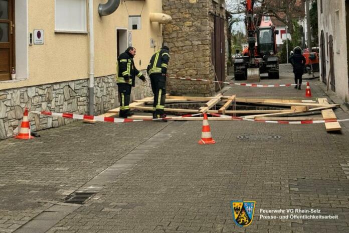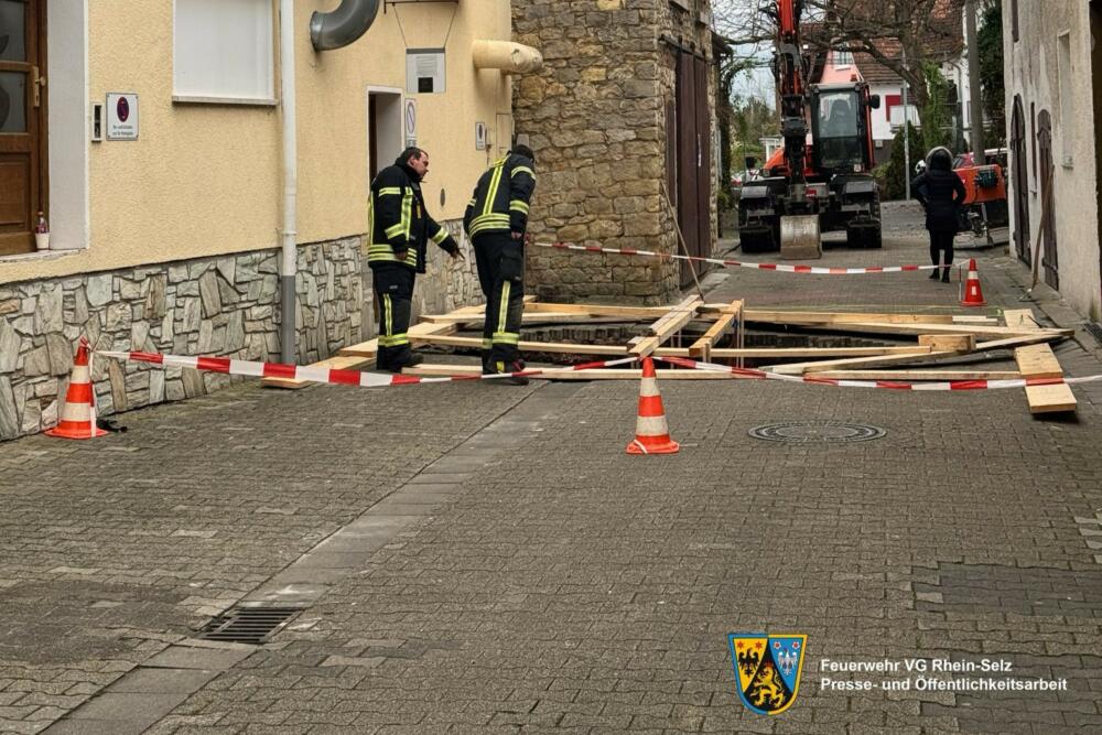 Abschließend teilt die Feuerwehr der Verbandsgemeinde Rhein-Selz mit: Durch einen Wasserrohrbruch aus ungeklärter Ursache wurde ein Teil des Kellerwegs unterspült, welcher daraufhin auf einer Fläche von 5×5 Metern eingestürzt ist. Zudem hatte sich ein unter dem Kellerweg liegender Gewölbekeller mit Wasser gefüllt.