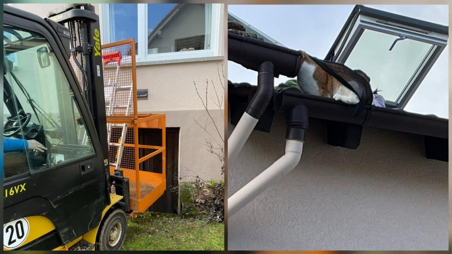 Ein Nachbar, der über die Situation hinzukam, bot spontan an, den Feuerwehrmann im Arbeitskorb seines Gabelstaplers nach oben zu fahren. Dank der Hilfe des Nachbarn konnte Martin Barth den fünf Jahre alten Kater Olaf zügig und unversehrt aus der Dachrinne heben und den glücklichen und erleichterten Kindern übergeben.
