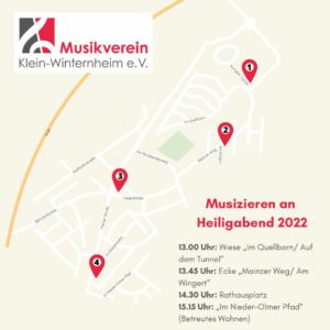 Der Musikverein Klein-Winternheim spielt wie jedes Jahr an Heiligabend weihnachtliche Musik in den Straßen von Klein-Winternheim. An insgesamt vier Stationen können Besucher die weihnachtliche Klänge in gemütlicher Atmosphäre genießen. Das Zuhören ist natürlich kostenlos, Spenden für die Jugendarbeit sind aber herzlich willkommen.