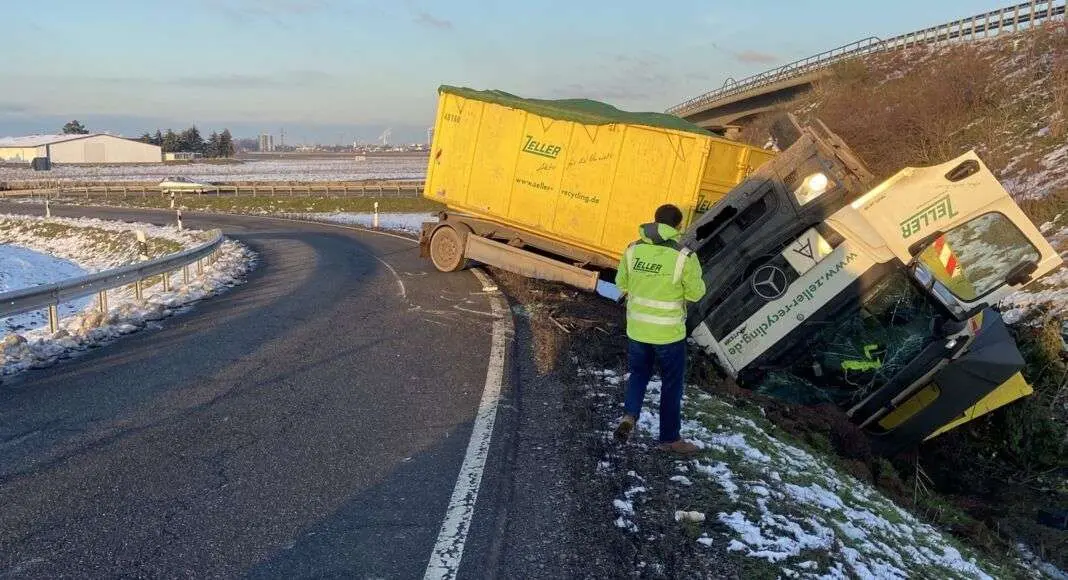 Am Montagabend (23. Januar 2023) kam es gegen kurz nach 16:00 Uhr zu einem Verkehrsunfall auf der Bundesstraße B9 in Ruchheim bei der Anschlussstelle Mutterstadt-Süd. Dort war ein Lastwagen umgekippt, was zu einer stundenlangen Vollsperrung führte.