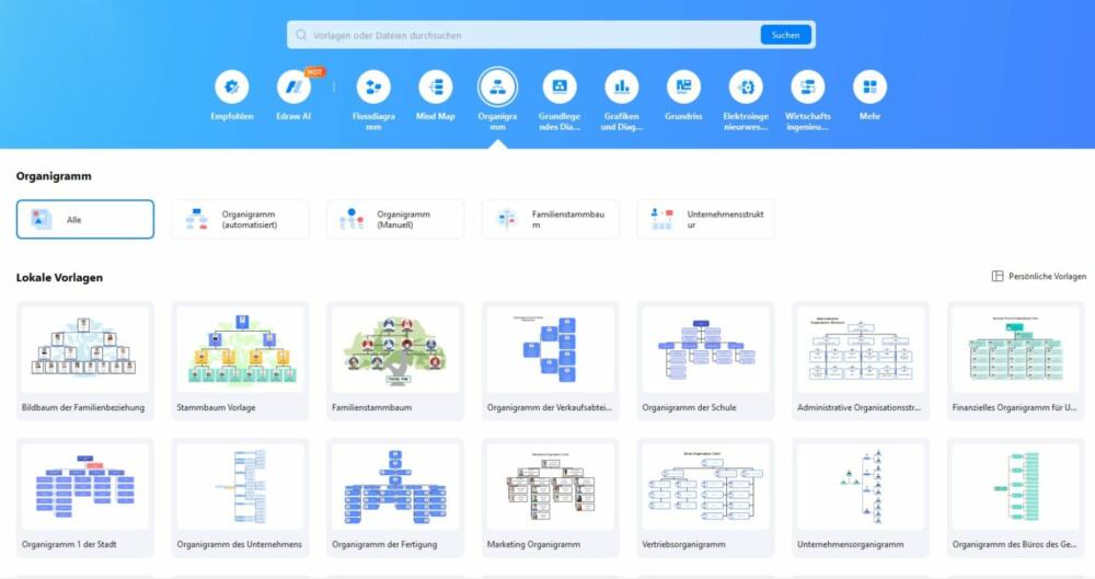 - EdrawMax-Vorlagen: EdrawMax bietet eine breite Palette an professionell gestalteten Vorlagen, die flexibel und anpassbar sind. Sie sind ideal für komplexere Organigramme und detaillierte Darstellungen.
