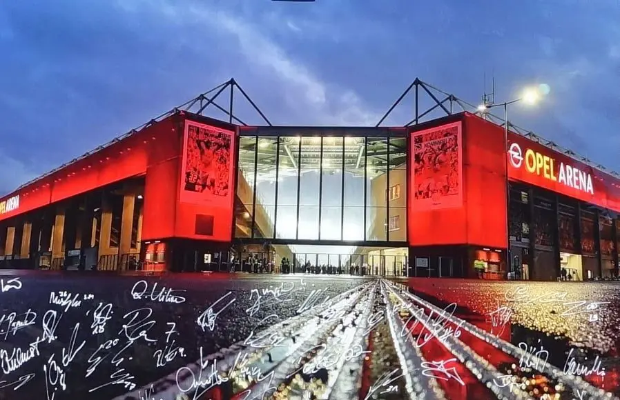 Bild der Opel-Arena mit Unterschriften der Spieler des 1. FSV Mainz 05