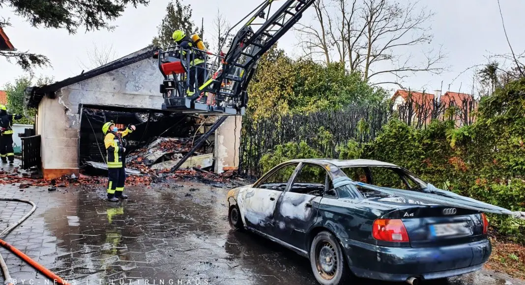 Die Bewohner bemerkten kurz vor dem Brand einen lauten Knall. Wenig später stand die Doppelgarage im Vollbrand und die Bewohner alarmierten die Feuerwehr. Die Rauchsäule war mehrere Kilometer entfernt sichtbar.