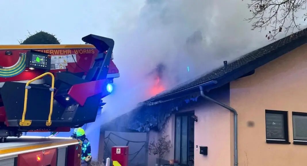 Feuerwehr Worms – Am Montagnachmittag, 10. November, hat ein Feuer im Wormser Stadtteil Horchheim einen umfangreichen Einsatz von Feuerwehr und Rettungskräften ausgelöst. Gegen 16 Uhr geriet zunächst eine Garage auf einem Grundstück In den Weingärten in Brand. Innerhalb kurzer Zeit breiteten sich die Flammen auf den Dachstuhl des direkt angrenzenden Wohnhauses aus. Durch die starke Rauchentwicklung war das Feuer bereits von weitem sichtbar.