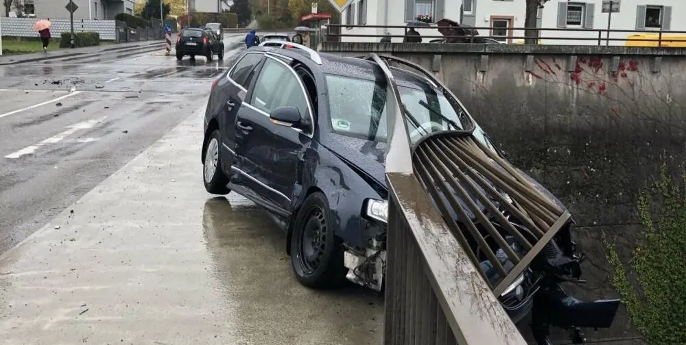 Durch den Zusammenstoß kam dessen Fahrzeug nach links von der Fahrbahn ab, durchbrach teilweise ein dortiges Brückengeländer und kam dort halb in der Luft hängend zum Stillstand. Der Mann erlitt durch den Unfall leichte Verletzungen, konnte sein Fahrzeug aber selbständig über die Beifahrertür verlassen. Der Unfallverursacher blieb unverletzt. Es entstand ein Gesamtsachschaden von ca. 80.000 Euro. Der VW Passat wurde durch Kräfte der Feuerwehr zunächst mittels mehrerer Seilwinden gegen Absturz gesichert bis er letztendlich durch ein Abschleppunternehmen geborgen werden konnte.