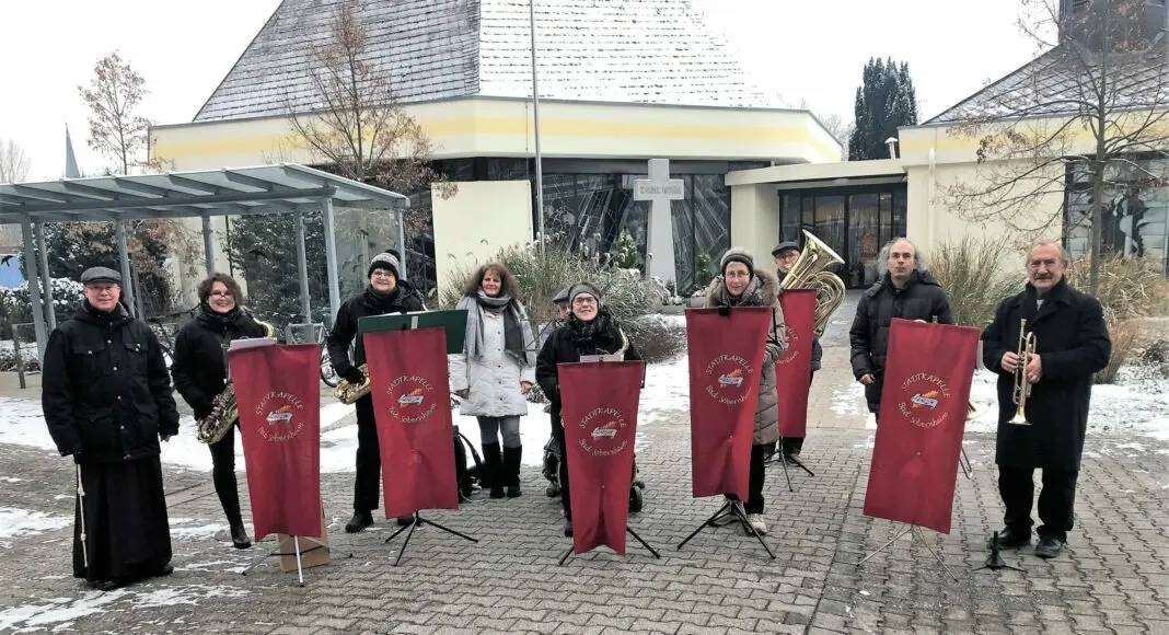 Den vierten Advent auch für die Patienten im Krankenhaus St. Marienwörth etwas feierlich gestalten – das haben sich die Musikerinnen und Musiker der Stadtkapelle Bad Sobernheim vorgenommen. Nachmittags ab 16 Uhr spielten sie bekannte Weihnachtslieder wie „Stille Nacht“ oder „O, du fröhliche“. Da es in den Krankenhäusern der Region immer noch Besuchsbeschränkungen gibt, postierte sich das 8-köpfige Blasorchester im Innenhof von St. Marienwörth, damit möglichst viele Patienten die Musikdarbietung von den Zimmern aus verfolgen konnten.
