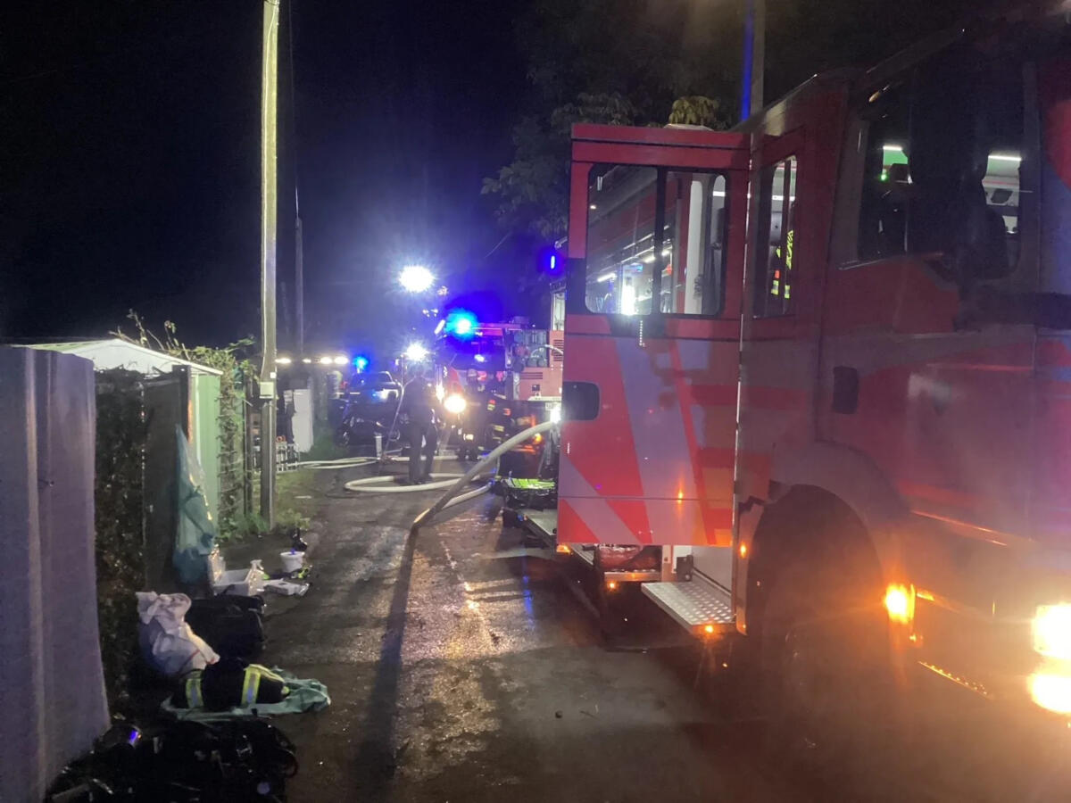 Beim Eintreffen brannten mehrere Wohn- und Geräteanbauten sowie Wohnwagen. Aus dem Brandbereich waren Hilferufe zu hören. Zwei Atemschutztrupps drangen in ein Gebäude vor und retteten eine eingeschlossene Person mit einer Brandfluchthaube ins Freie. Der Rettungsdienst versorgte die betroffene Person vor Ort – ein Transport ins Krankenhaus war nicht erforderlich.