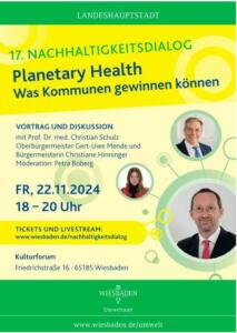 Am 22. November 2024 findet im Kulturforum Wiesbaden der 17. Nachhaltigkeitsdialog statt. Unter dem Titel „Gesundheit und Ökosysteme: Ein untrennbares Band“ laden das Umweltamt Wiesbaden, das Gesundheitsamt und die Hochschule RheinMain zu einer spannenden Diskussion über die Verknüpfung von menschlicher Gesundheit und planetaren Ökosystemen ein.