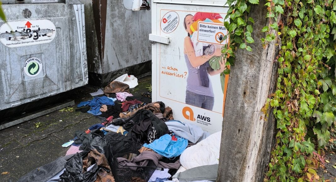 Die Mitarbeiter des Bauhofs sind bis zu dreimal pro Woche damit beschäftigt, die vermüllten Containerstandorte zu reinigen. Zur Verunreinigung trägt bei, dass die Container aufgebrochen und die entnommenen Kleider über den Boden verstreut werden.
