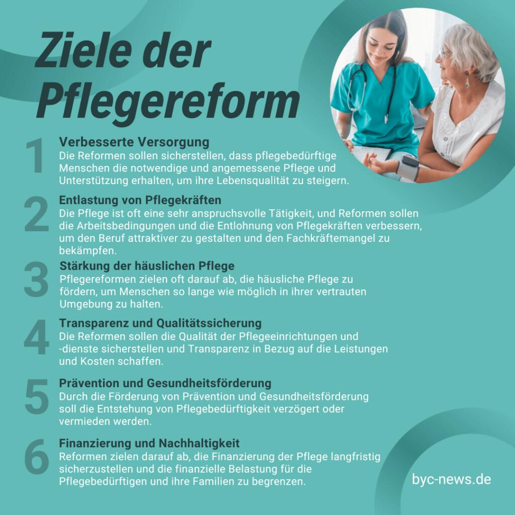 In einer alternden Gesellschaft müssen proportional immer weniger Beschäftigte immer mehr Menschen im nicht mehr erwerbsfähigen Alter unterstützen. Je älter Menschen werden, desto größer wird die Gefahr einer Pflegebedürftigkeit, die in Deutschland in fünf Pflegestufen gemessen wird. Dies führt dazu, dass das Pflegesystem nur aufrechterhalten werden kann, wenn die Belastungen für die Beitragszahler in der Pflegefinanzierung tendenziell zunehmen. Diesen Zweck erfüllt die Pflegereform, die seit dem 1. Juli 2023 gültig ist.