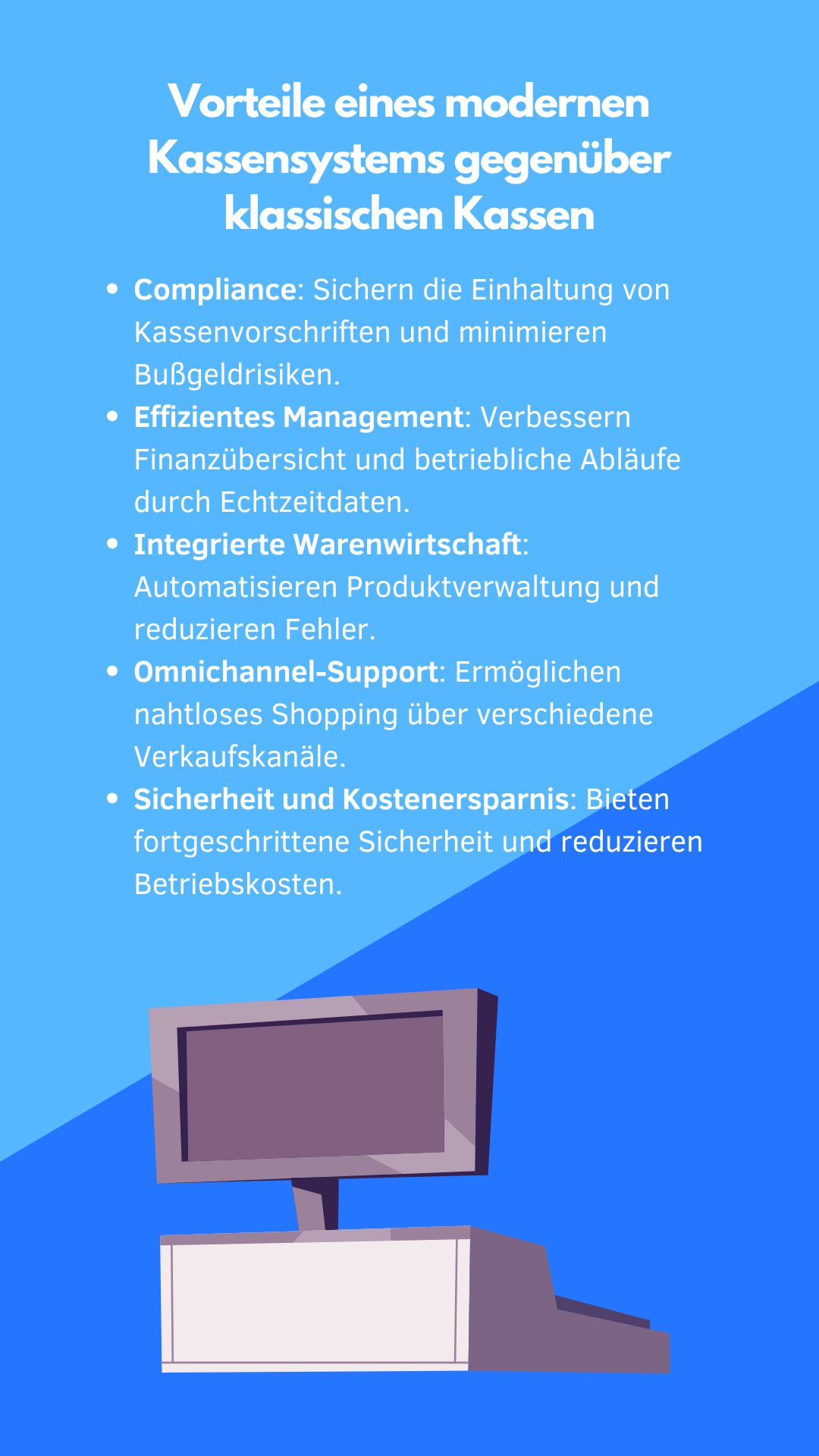 Dies hilft Unternehmen, Bußgelder und rechtliche Konsequenzen zu vermeiden, die sich aus Verstößen gegen Kassenvorschriften ergeben können. Im Gegensatz dazu sind klassische Kassen möglicherweise nicht in der Lage, alle erforderlichen Anforderungen zu erfüllen und bergen ein höheres Risiko für Fehler und Missbrauch.