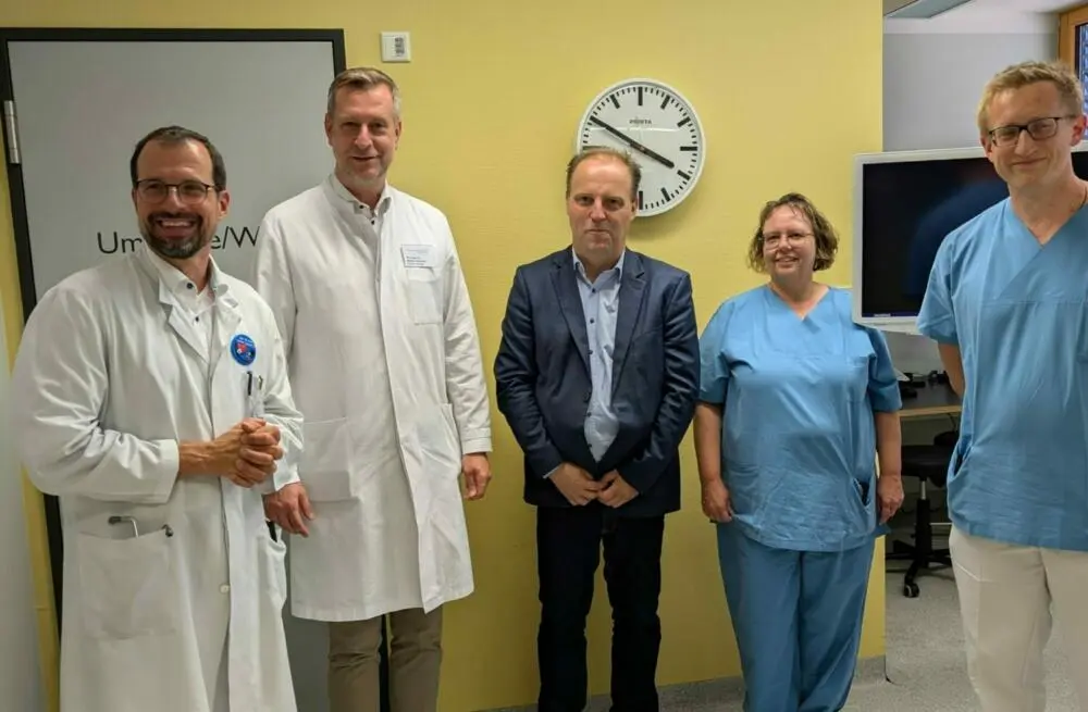 Ein weiterer Schwerpunkt des Besuchs war die Besichtigung des neuen Endoskopie-Turms, der mit modernster Künstlicher Intelligenz (KI) ausgestattet ist. Dieses hochmoderne Gerät unterstützt die Ärzte dabei, selbst kleinste Gewebeveränderungen zu erkennen und ermöglicht somit eine präzisere Diagnostik. „Durch den Einsatz der KI können wir mögliche Krankheiten viel früher erkennen. Gerade weit verbreitete Volkskrankheiten wie Darmkrebs lassen sich so effektiver vorbeugen,“ erklärte Prof. Dr. Schmitz.